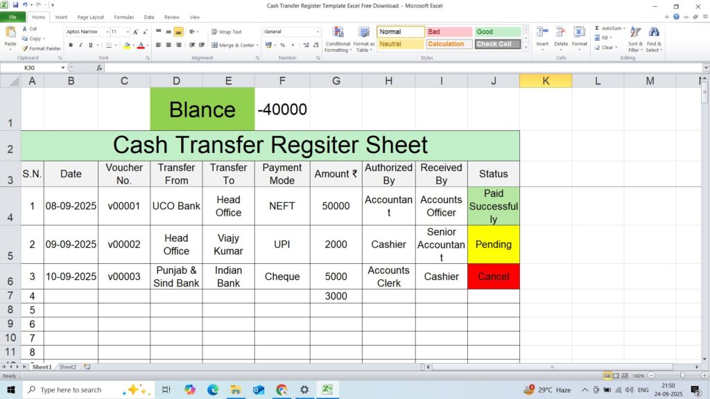 Cash Transfer Register Template Free Download PDF & Excel File September 24, 2025 by PRAMODCash Transfer Register Template PDF Free DownloadDownloadCash Transfer Register Template Excel Free DownloadDownloadSpread the love