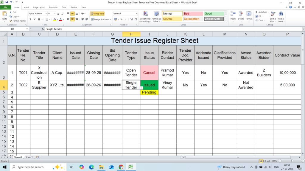 Tender Issued Register Sheet Template Free Download Excel Sheet September 27, 2025 by PRAMODTender Issued Register Sheet Template Free Download Pdf fileDownloadTender Issued Register Sheet Template Free Download Excel SheetDownloadSpread the love
