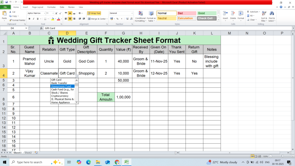 Wedding gift tracker template sheet format excel file & pdf file download free October 30, 2025 by PRAMODWedding gift tracker template sheet format pdfl file download freeDownloadWedding gift tracker template sheet format excel file download freeDownloadSpread the love